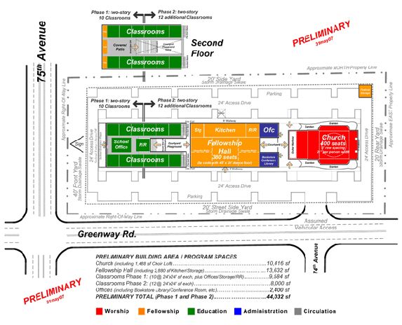 In 2001, the Strategic Planning Committee, after looking at several locations, recommended the purchase of a five-acre piece of land, at the intersection of 75th Ave. and Greenway Road, to serve as the permanent parish location. Following the approval of the Parish General Assembly, the property was purchased in